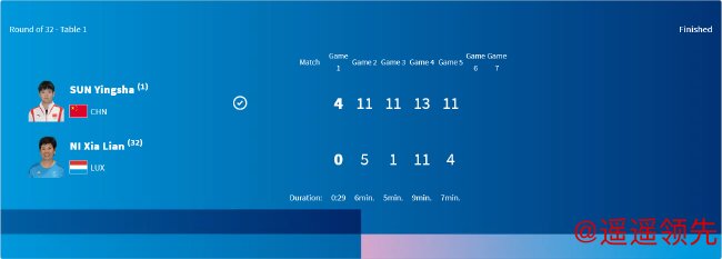 第四局,孙颖莎开局3-0领先。双方各得1分后(4-1),倪夏莲叫暂停。暂停回来,倪夏莲再追1分(4-2)。双方各得1分后(5-3),莎莎连追3分,8-3扩大领先优势。倪夏莲又追1分后,孙颖莎再下3分,以11-4再胜一局,大比分4-0晋级女单16强。