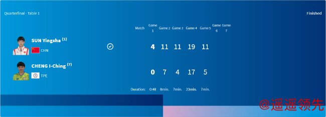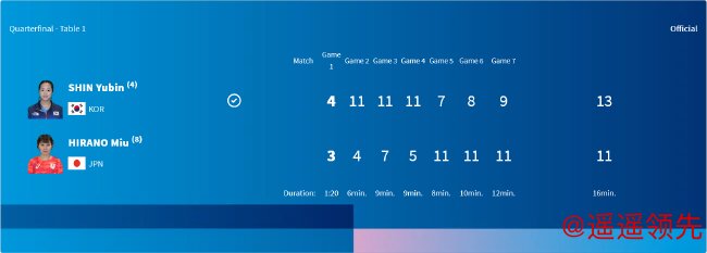 在早前结束的一场女单1/4决赛中,4号种子、韩国选手申裕斌和8号种子、日本选手平野美宇苦战了7局,最终,申裕斌以4-1(11-4/11-7/11-5/7-11/8-11/9-11/13-11)险胜晋级4强,整场比赛耗时1小时20分钟。