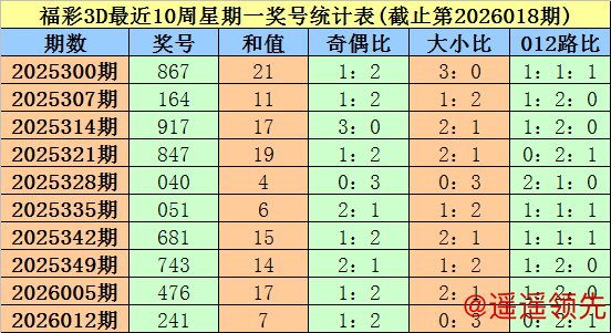 福彩3D第2026012期(上周星期一)奖号为241。其中奖号奇偶比为1:2,大小比为0:3,012路比为0:2:1。