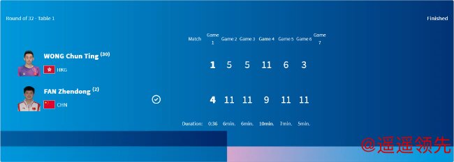 第五局,樊振东开局5-0领先。黄镇廷追回2分后,“小胖”再下3分,8-2扩大领先优势。黄镇廷再追1分后,樊振东连下3分,11-3再下一城,大比分4-1顺利晋级男单16强。